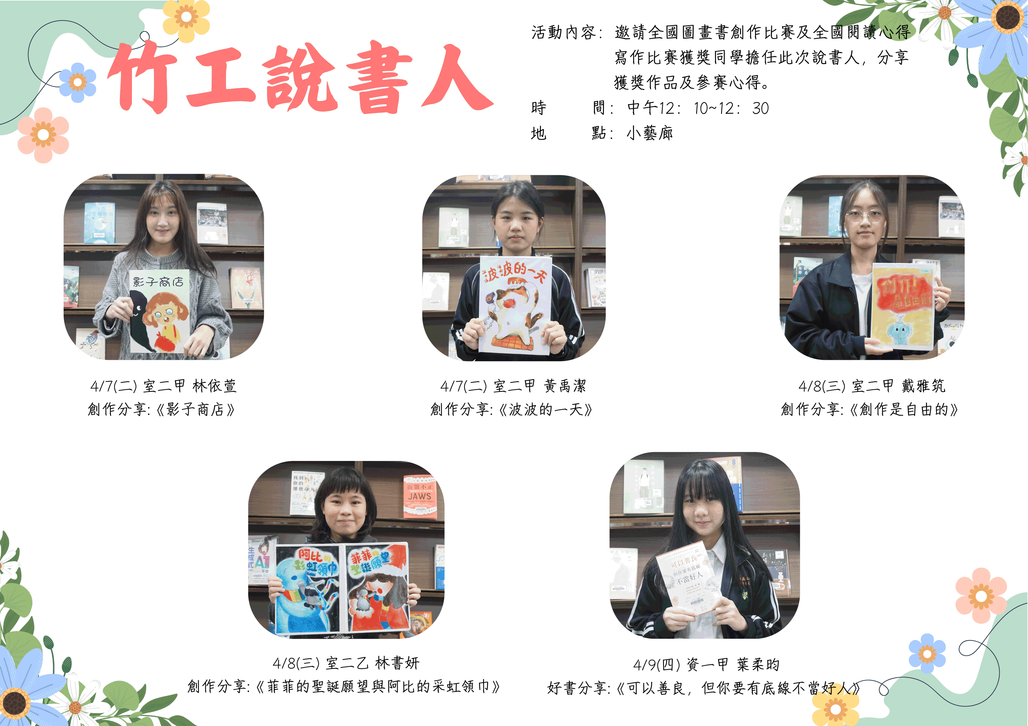 場 次 一:4.7(二) 室二甲 林依萱 分享好書:《影子商店》、室二甲 黃禹潔 分享好書:《波波的一天》